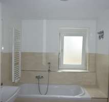 Badezimmer mit Fenster, Dusche, Badewanne, Hochwertige Holzfußböden in den Wohnräumen.